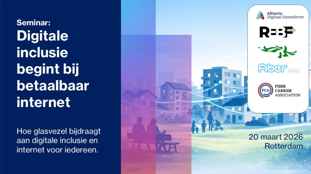 Op vrijdag 20 maart 2026 organiseren Fiber Groep, de Fiber Carrier Association (FCA) en de gemeente Rotterdam, in samenwerking met REBF, het seminar “Digitale Inclusie – Transitie naar betaalbaar internet voor iedereen” in het Timmerhuis in Rotterdam.